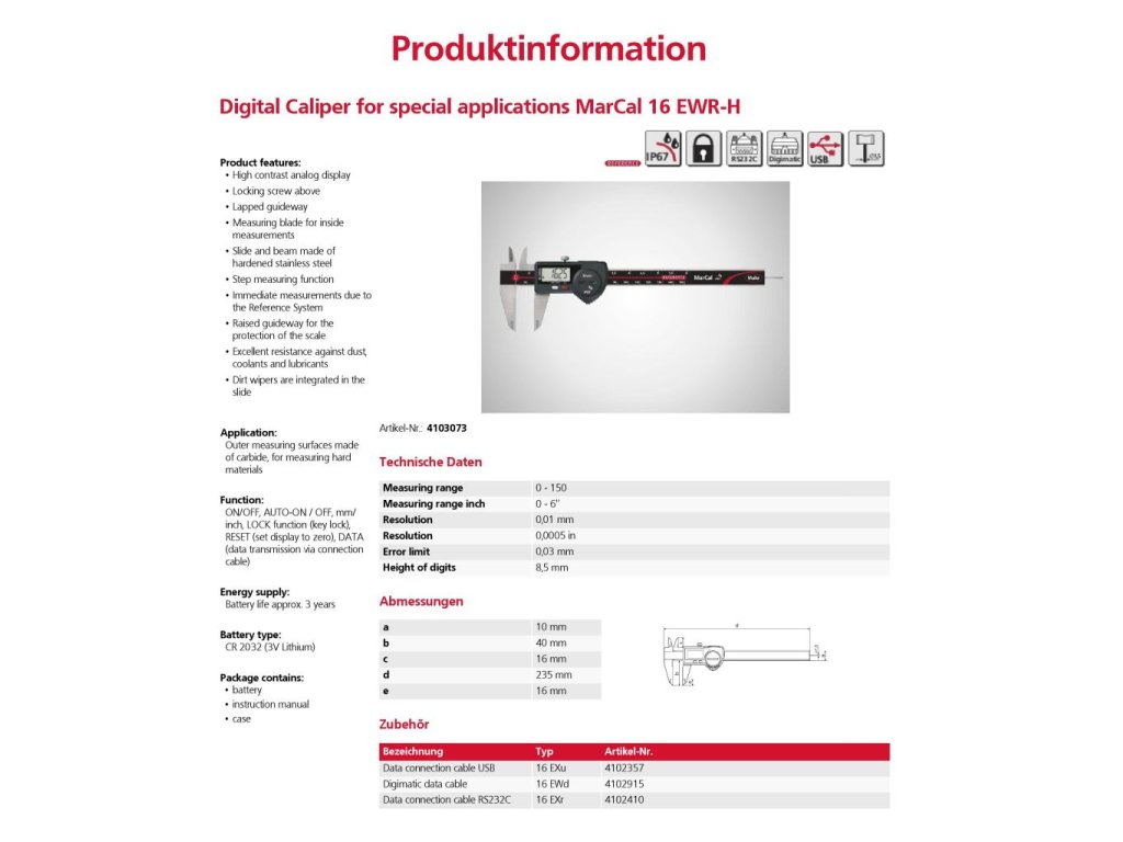 Digitální posuvné měřítko 150/0,01 mm, tvrdokov, IP67 | MarCal 16 EWR-H Mahr