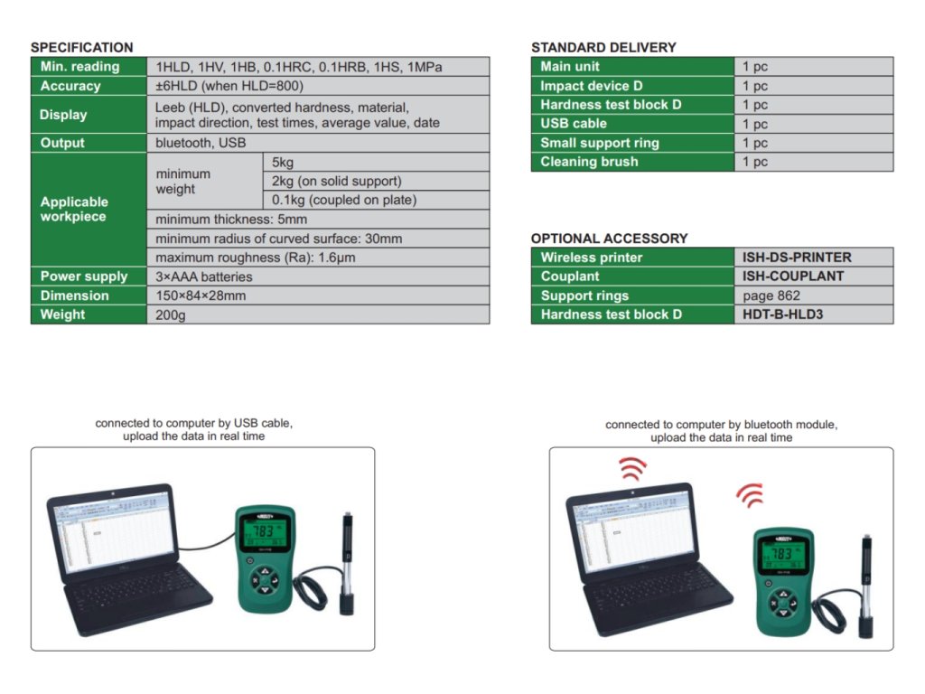 - Základní měření v Leeb (HLD), možno převést na Vickers (HV), Brinell (HB), Rockwell (HRC, HRB), Shore (HS) a MPa